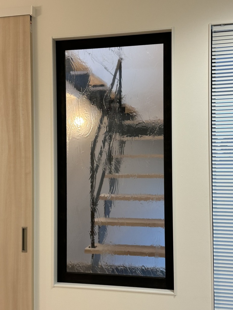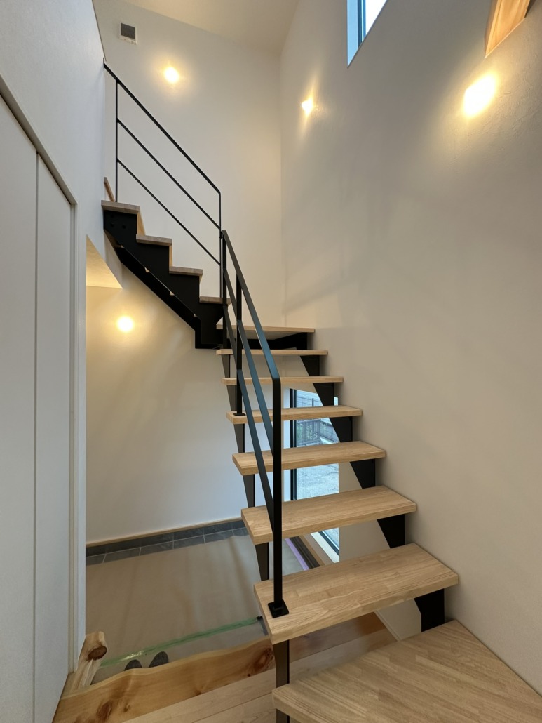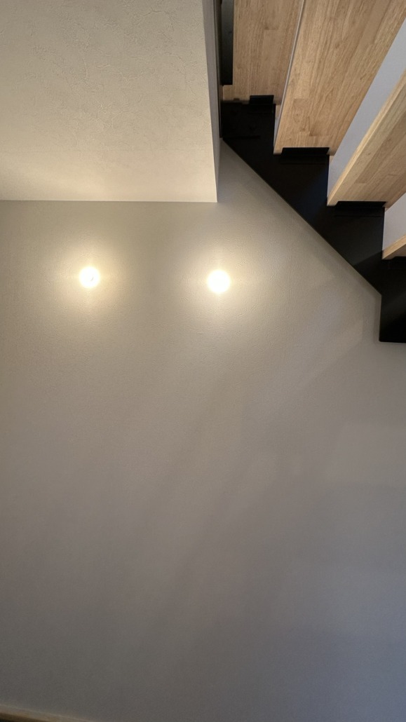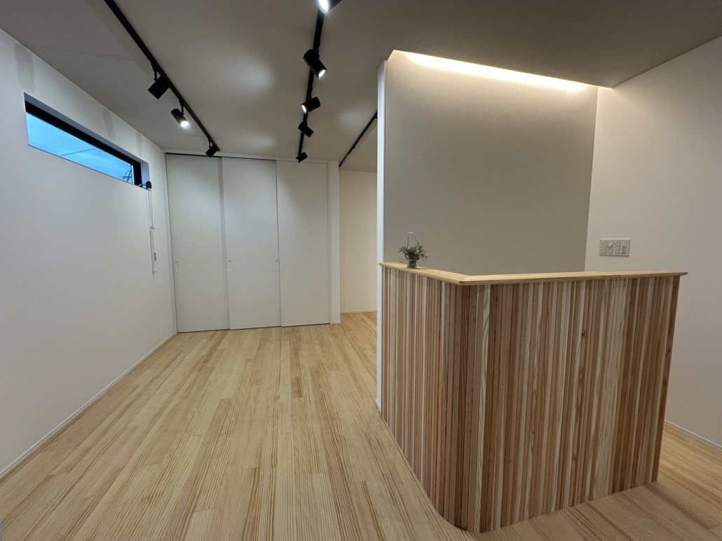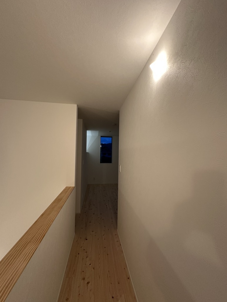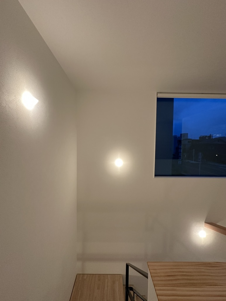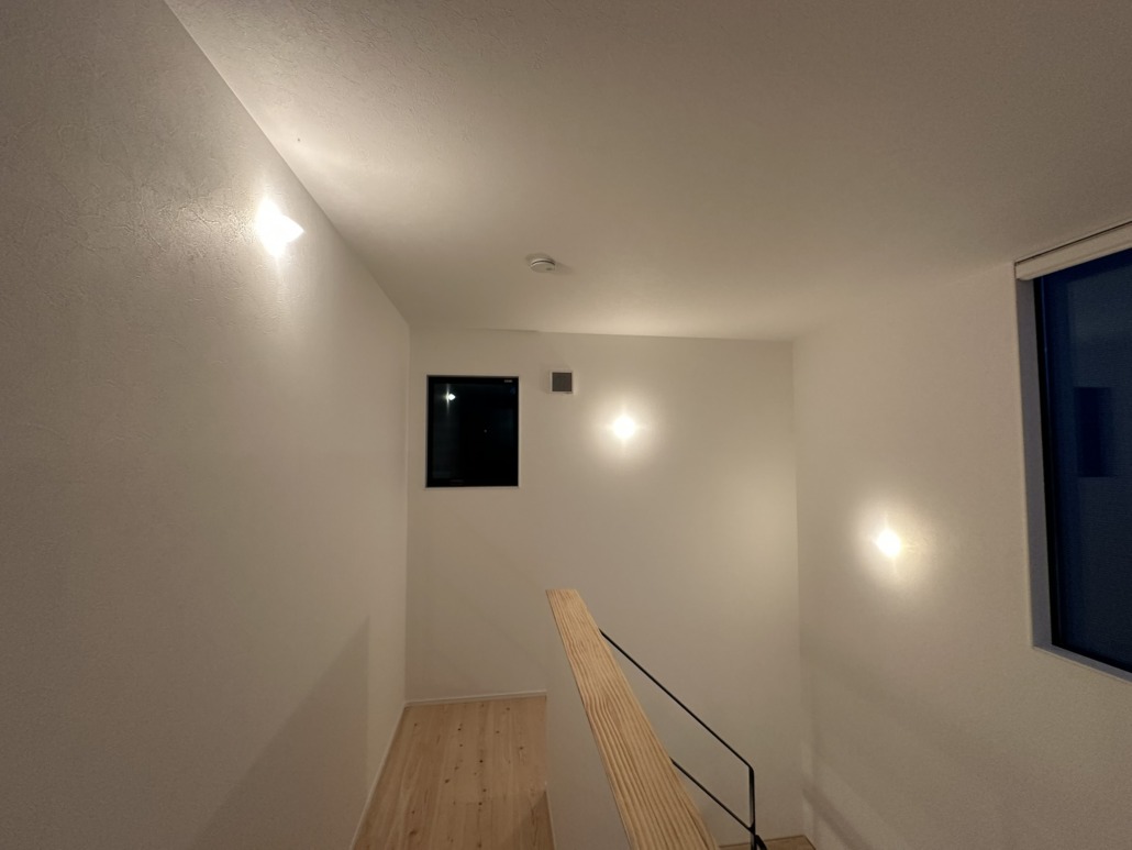 光源を主張させるのではなく、素材と同じレイヤーに置く。1階から吹き抜けを上がった光は2階の個室に緩やかな明るさをもたらす。
