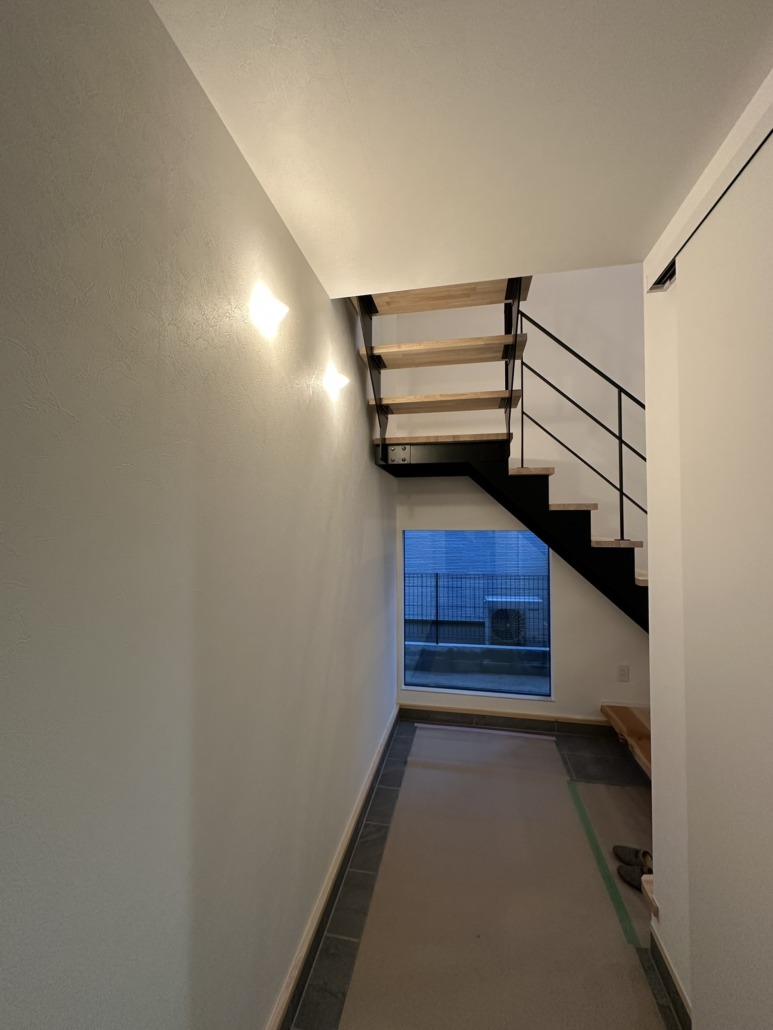 塗り壁のわずかな凹凸、無垢材の繊細な木目、鉄の静かな質量感。