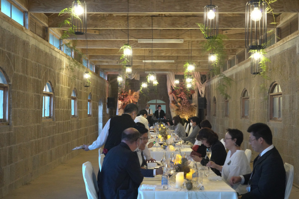 明治時代の砲台跡が緑に覆われ、自然と一体化したような異空間。その奥にたたずむレンガ造りの建物。100年以上も前、砲弾庫として使われていた建物は静かにその役目を終え、江田島の観光名所となっています。その名所にまた新たな価値が吹き込まれるイベント。シェフが腕をふるい、DJの音楽、そしてドライフラワーと照明が会場を彩ります。メイン照明は、アイアンのフラワーベースで製作したペンダントライトをランダムに。ペンダントにあしらったアスパラペラが海風にふんわり揺れていました。お客様の笑顔が建物とともに現代の平和を象徴するものとして印象に深く残りました。